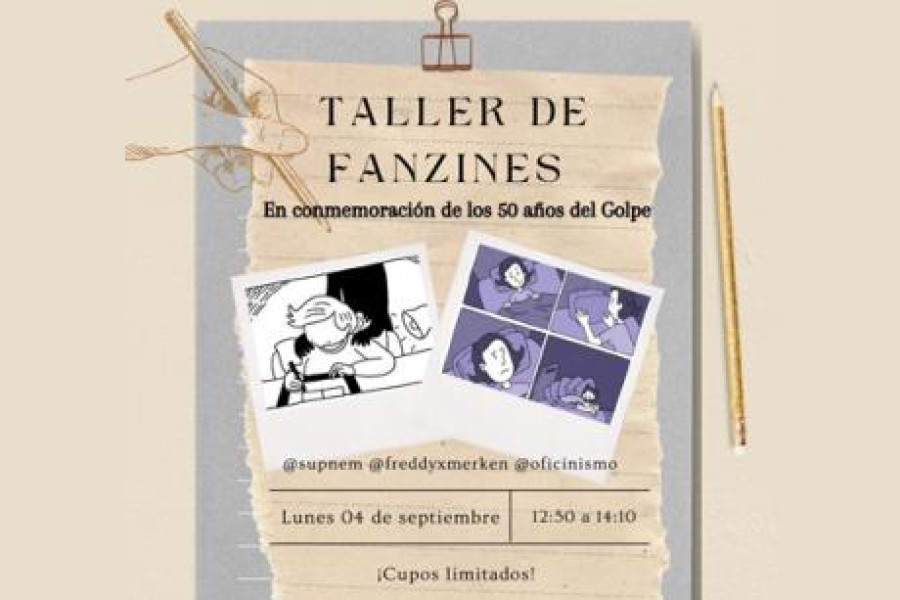 El próximo lunes 4 de septiembre, entre las 12:50 y las 14:10 horas, los reconocidos artistas gráficos Supnem, Freddy Merkén y Oficinismo, dirigirán el “Taller de Fanzines”, actividad enmarcada en la conmemoración de los 50 años del golpe de Estado.