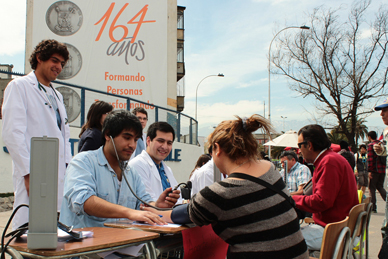 En la explanada de ingreso al campus, frente a la Estación Central, estudiantes de la Carrera de Medicina de la U. de Santiago de Chile, se instalaron ayer (30) con su equipamiento para atender a los transeúntes y ayudarlos en la prevención de la hipertensión arterial.Provistos de sus fonendos y esfingomanómetros, los jóvenes enseñaron a las personas, a través de simples pasos a prevenir una de las enfermedades silenciosas que más afecta a la población nacional.“Es primera vez que hacemos esta feria”, recalcó Paulina Sáez, estudiante de tercer año y presidenta de Federación Internacional de Asociaciones de Estudiantes de Medicina (IFMSA) de la U. de Santiago.La joven destacó además que el operativo se realizó con la colaboración de la Vicerrectoría de Apoyo al Estudiante y de otras carreras de la Facultad de Ciencias Médicas, como Obstetricia que facilitó equipamiento.“Nos ha servido para mostrar a la gente lo que hace nuestra Facultad y, en el caso de los estudiantes, la práctica directa con el público ha sido de aprendizaje, porque nos permitió evaluar la salud de las personas, enseñar sobre medicina preventiva y desarrollar habilidades blandas sobre todo en la relación entre médico-paciente”, indicó.La iniciativa se enmarcó en la campaña internacional Operation Hope de IFMSA para recaudar fondos en ayuda de los refugiados sirios que están en Jordania, por lo que hubo recolección de dinero que será enviado por los estudiantes a la central internacional de distribución.