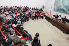 En el marco de la inauguración del año académico 2015, la escritora Isabel Allende compartió una amena conversación con estudiantes de nuestra Universidad en el Salón de Honor. Temas como sus inicios en la narrativa, su método para contar historias y sus opiniones acerca de la literatura, fueron algunas de las ideas del distendido conversatorio, donde la narradora hizo gala de su genialidad fresca, perspicaz e hilarante, al responderle a las y los jóvenes.